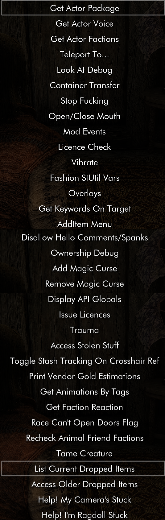 - Debug menu (mostly copied verbatim; some are self explanatory, others not so much)