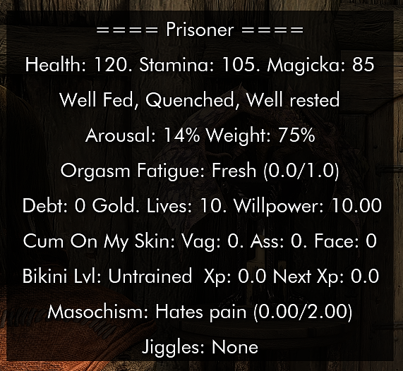 - Player status (attributes/survival stats/SLA/orgasm fatigue/DF stats/cum stats/bikini level/STA stats/jiggles)